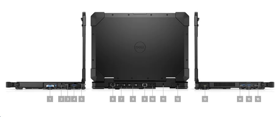 1. Отсек для основного съемного накопителя SATA | 2. Разъем для карты памяти SD | 3. Разъем для SIM-карты | 4. Порт USB 3.0 | 5. Перо (опционально) | 6. Сетевой разъем RJ-45 Gigabit Ethernet (опционально) | 7. Второй последовательный порт, разъем VGA, порт DisplayPort или Fischer USB | 8. Встроенный последовательный порт | 9. Сетевой разъем RJ-45 Gigabit Ethernet | 10. Разъем HDMI | 11. Гнездо для замка Noble | 12. Входной разъем постоянного тока | 13. Порт USB 3.0 Type-C™ | 14. Порт USB 3.0 | 15. Порт USB 3.0 | 16. Универсальный аудиоразъем